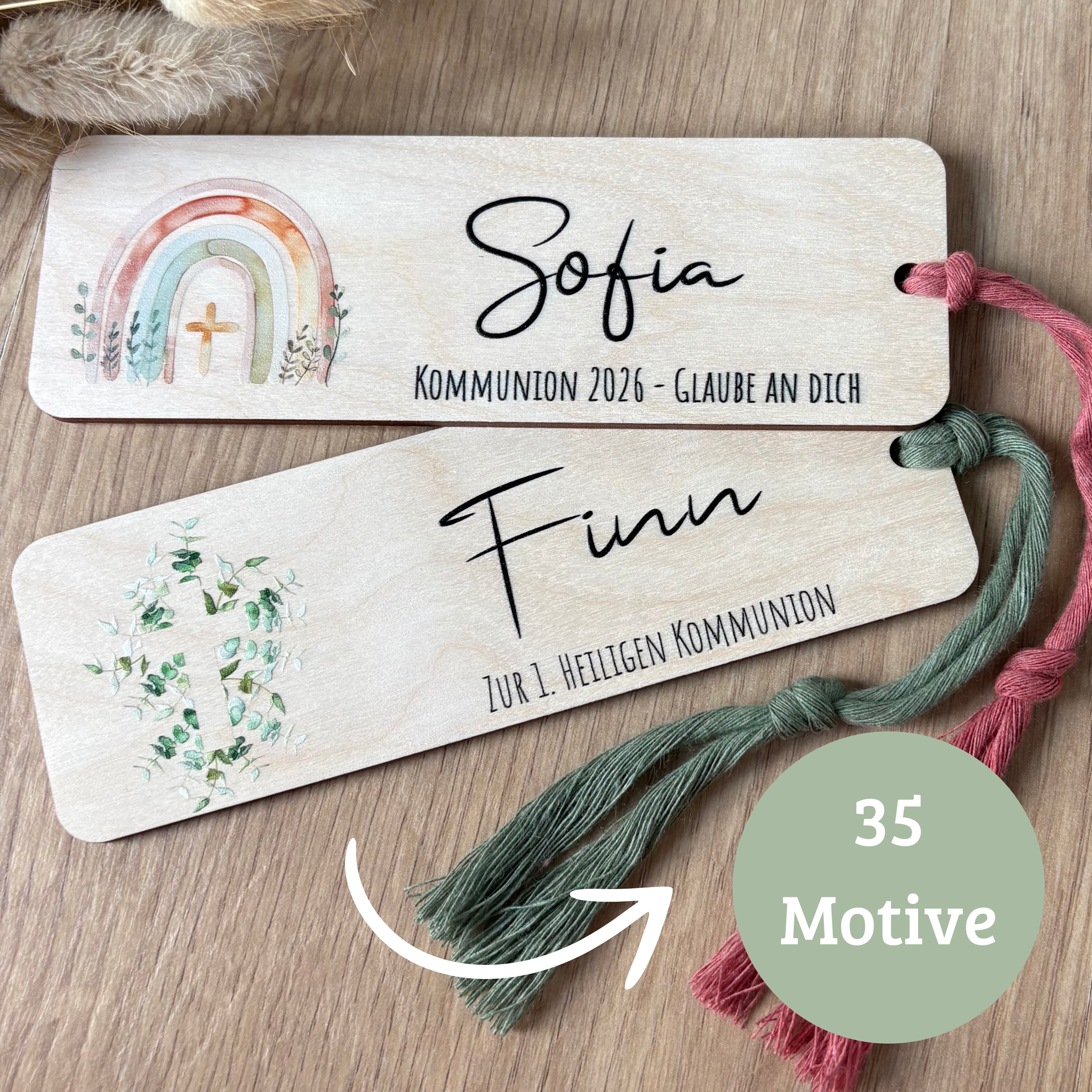 Kommunion Lesezeichen mit Name personalisiert | 35 Motive | Holz mit Band | Geschenkidee zur Kommunion