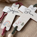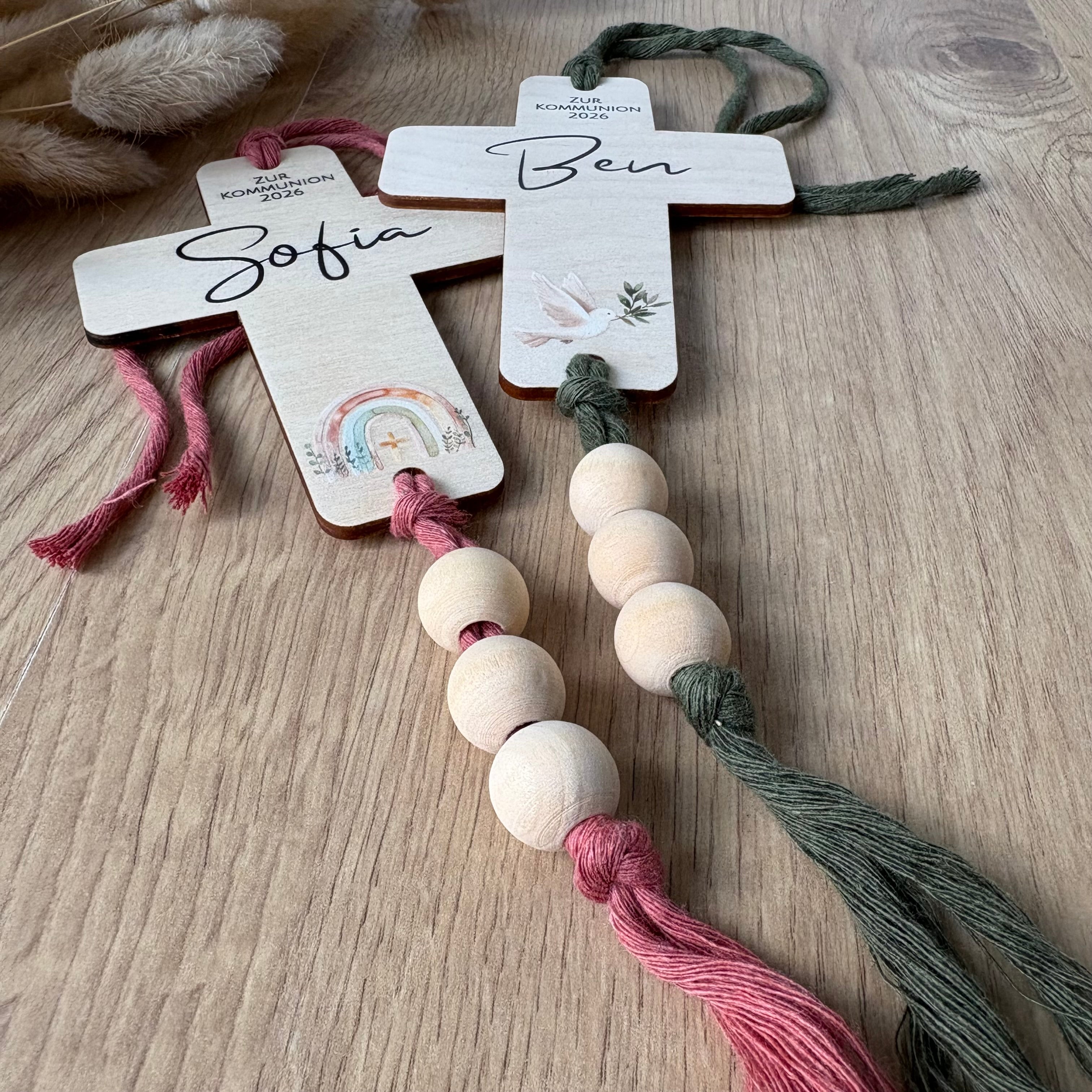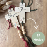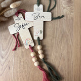 • Ein personalisiertes Kreuz mit Holzperlen und Band