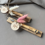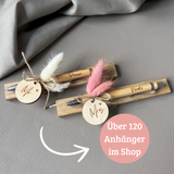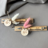 Dieses schĂśne Kugelschreiber-Set ist ein liebevolles Geschenk fĂźr frisch Vermählte oder zum Hochzeitstag â ideal, um âMr & Mrsâ mit einer persĂśnlichen Note zu feiern. Die gravierten Bambus-Kugelschreiber werden mit einem passenden Holzanhänger, zarten Trockenblumen, edlem Textilband und einem rustikalen HolzstĂźck geschmackvoll arrangiert. Eine besondere Aufmerksamkeit, die Erinnerungen an einen unvergesslichen Tag wachruft und dem Brautpaar ein Lächeln schenkt â perfekt als Geschenk zur Hochzeit oder fĂźr die Flitterwochenkiste.