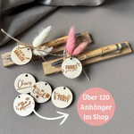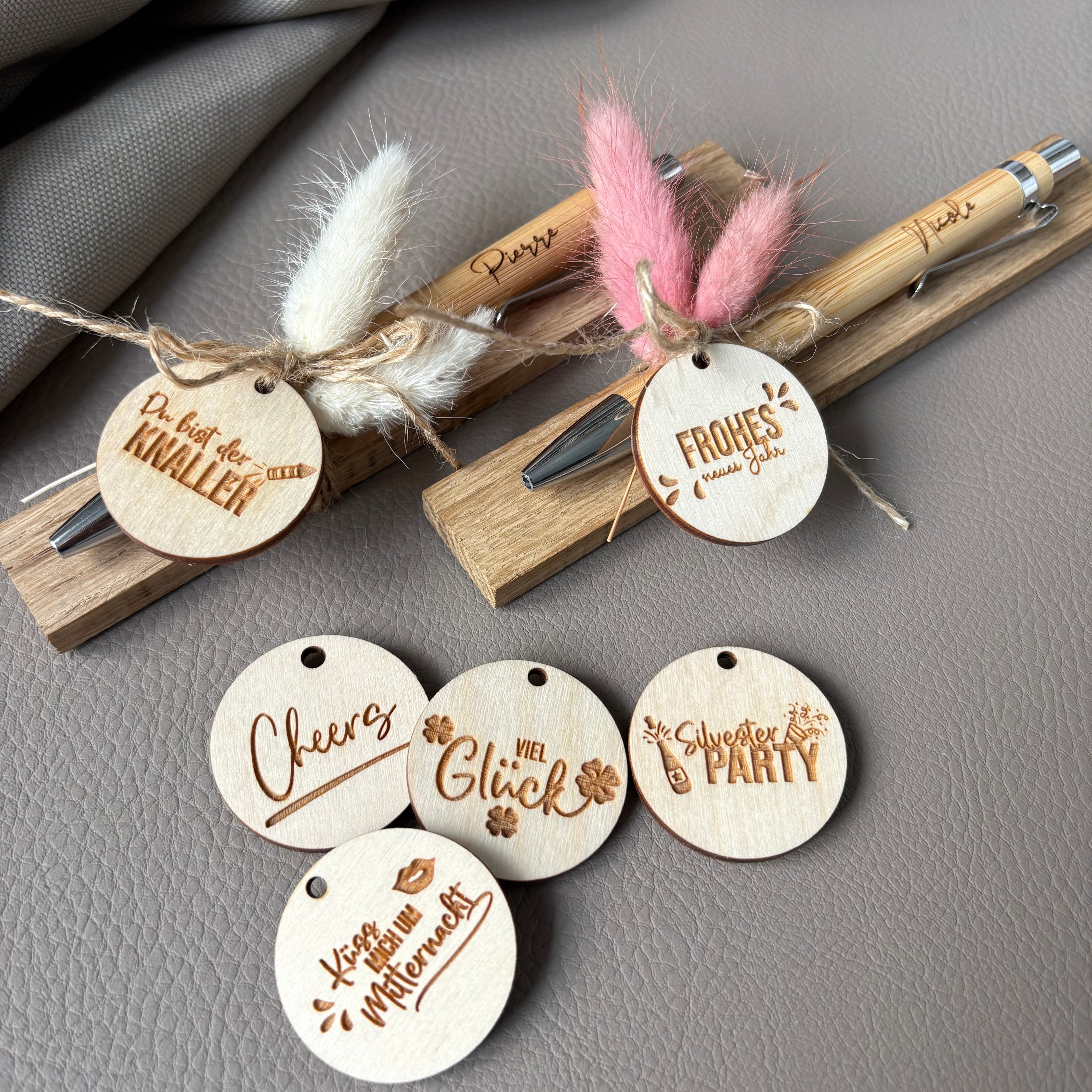 Dieses besondere Kugelschreiber-Set ist ein schönes Geschenk zum Jahreswechsel – ideal als kleine Geste für Freunde, Familie oder Kollegen. Der Kugelschreiber aus Bambus wird mit einem individuellen Namen graviert und zusammen mit einem Holzanhänger mit einem von mehreren Silvester-Sprüchen – wie „Frohes Neues“ oder „Cheers“ – dekorativ arrangiert. Zarte Trockenblumen, ein feines Textilband und ein rustikales Holzstück runden das Set ab. Ein persönliches Präsent, das Freude schenkt und gute Wünsche für das neue Jahr überbringt.