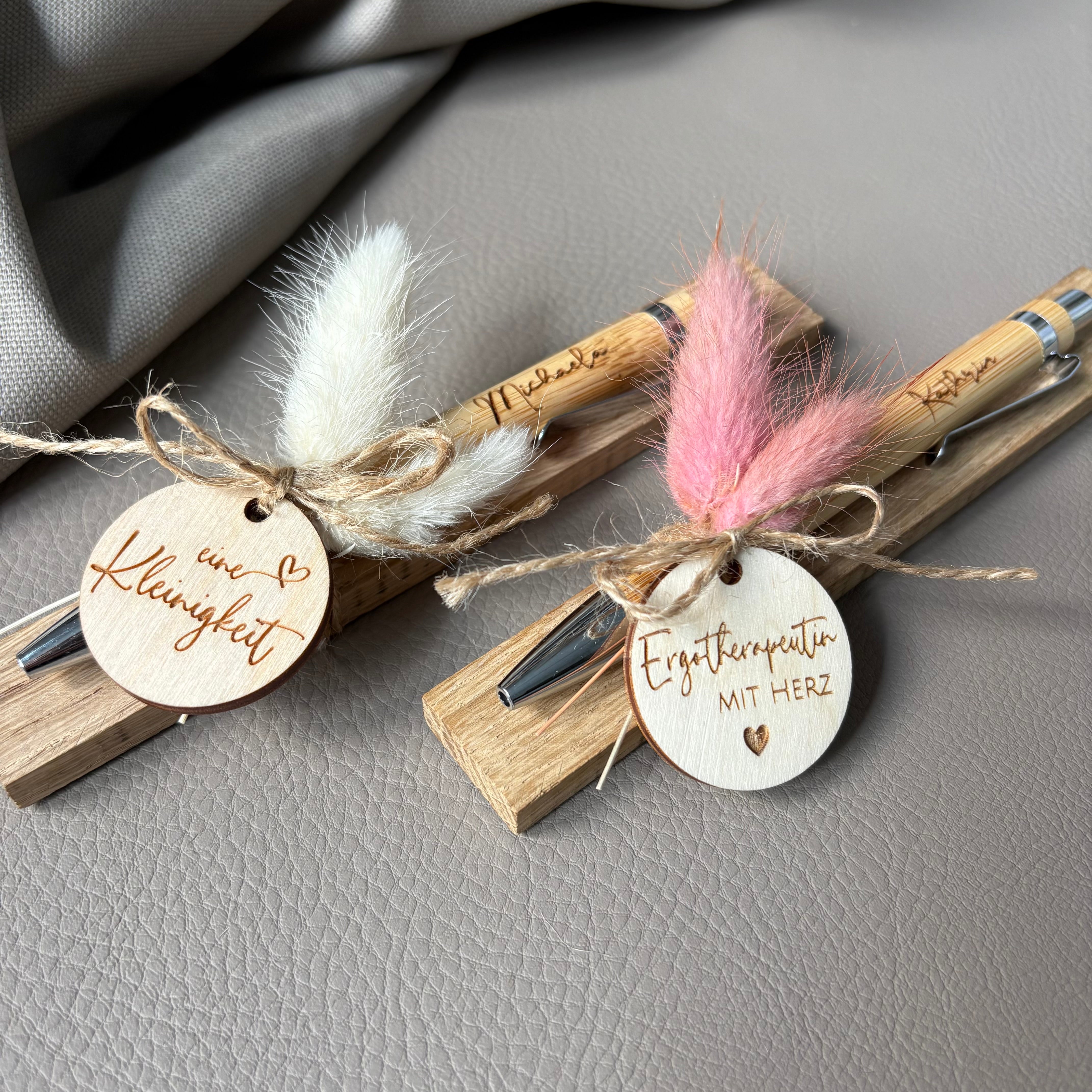 Dieses liebevoll gestaltete Kugelschreiber-Set ist eine besondere Anerkennung für Ergotherapeutinnen und Ergotherapeuten, die mit Kreativität, Geduld und Herz Menschen dabei unterstützen, Selbstständigkeit und Lebensqualität zurückzugewinnen. Ob als Dankeschön zwischendurch, zum Praxisjubiläum oder als wertschätzendes Abschiedsgeschenk – dieses Set verleiht Wertschätzung eine persönliche Note. Der fein gravierte Kugelschreiber aus nachhaltigem Holz wird zusammen mit einem dekorativen Holzanhänger, zarten Trockenblumen, einem eleganten Textilband und einem rustikalen Holzstück stilvoll arrangiert. Ein Geschenk, das nicht nur praktisch ist, sondern auch die wertvolle Arbeit und das Herz hinter jeder Therapie sichtbar macht.