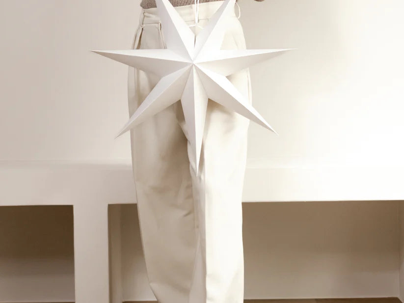 Unser Papierstern in der Größe 60 cm in Weiß ist ein eleganter Blickfang für die Advents- und Weihnachtszeit. Mit seinen sieben harmonisch geformten Zacken und dem hochwertigen, matten Papier verleiht er jedem Raum eine ruhige, stilvolle Ausstrahlung. Das schlichte, zeitlose Design fügt sich mühelos in verschiedenste Einrichtungsstile ein – von modern-minimalistisch bis hin zu klassisch und festlich. Besonders schön wirkt der Stern in Kombination mit weiteren Modellen: Im Shop ist er in verschiedenen Größen und Farben erhältlich, sodass sich ganz individuelle Arrangements gestalten lassen. Dank seiner durchdachten Konstruktion kann der Stern nach Weihnachten bequem zusammengefaltet und platzsparend verstaut werden – ideal für alle, die Wert auf langlebige, nachhaltige und stilvolle Weihnachtsdekoration legen. Ein hochwertiges Designobjekt, das Wärme, Harmonie und festliche Stimmung in Ihr Zuhause bringt – perfekt für eine besinnliche Adventszeit und ein stimmungsvolles Weihnachtsfest.