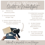 Deine Bestellung wird mit Liebe und grĂśĂter Sorgfalt verpackt, damit sie sicher bei dir ankommt. Wir verwenden nachhaltige und plastikfreie Verpackungsmaterialien. Du kannst dich auf eine schnelle Lieferung innerhalb weniger Tage freuen. Wenn du eine besonders schnelle Lieferung benĂśtigst, melde dich gerne bei uns.